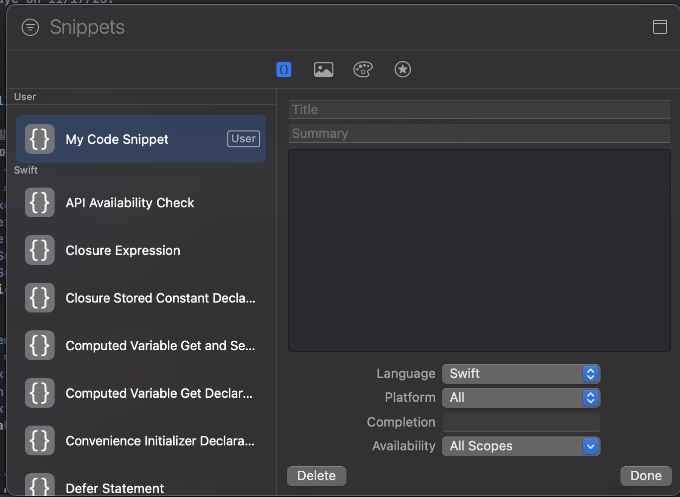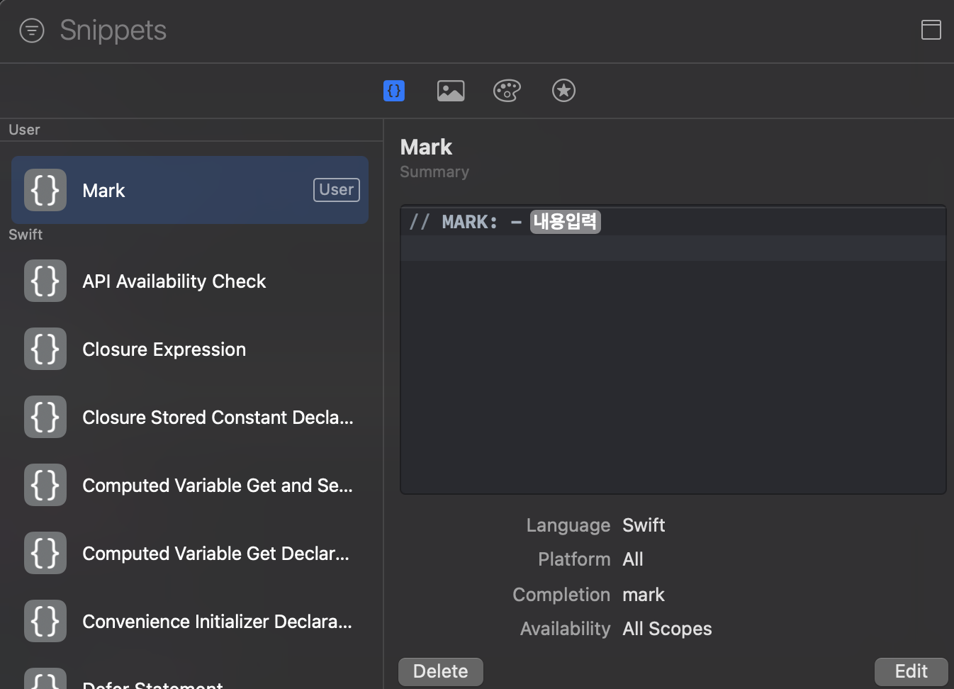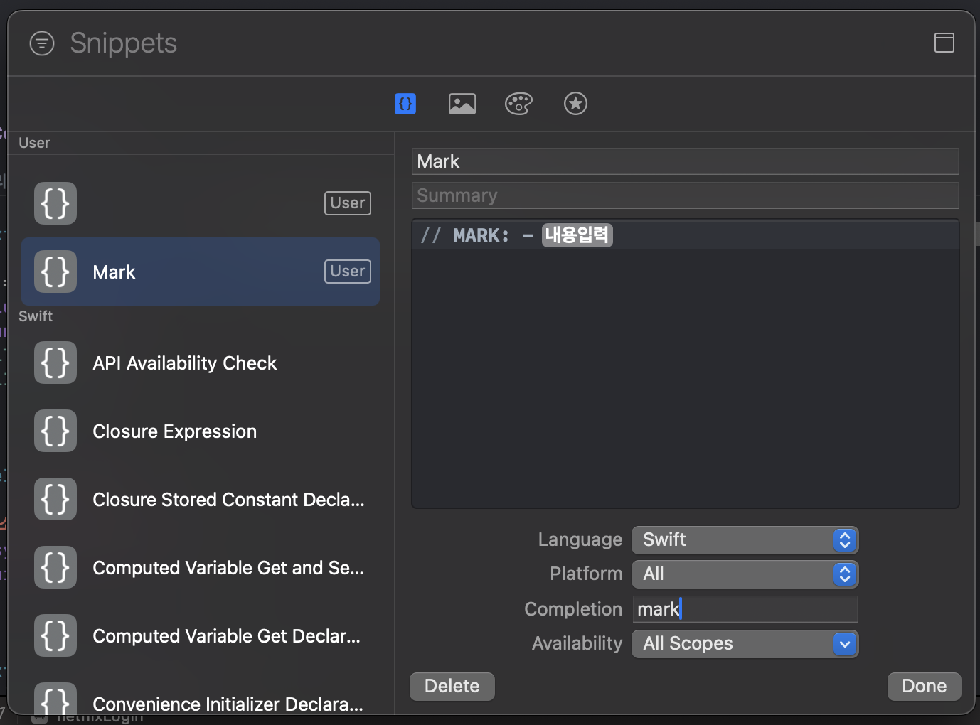 title, 나타낼 코드 그리고 Completion(단축어)만 설정하면 됨