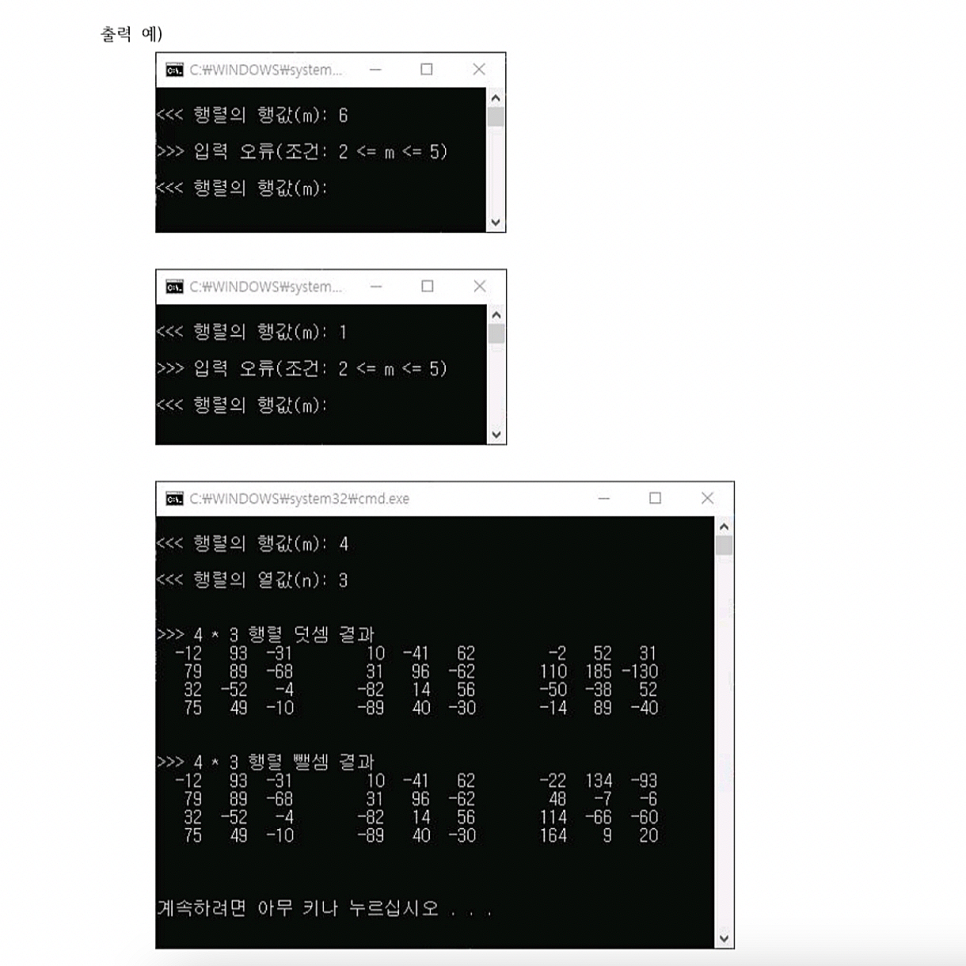 (프로그램 작성시 4개 이상의 함수로 구성된 프로그램을 작성하고, 키보드로부터 입력받은 값이 조건에 맞지 않을 경우 오류 메시지를 출력하고 다시 입력받도록 할 것.)