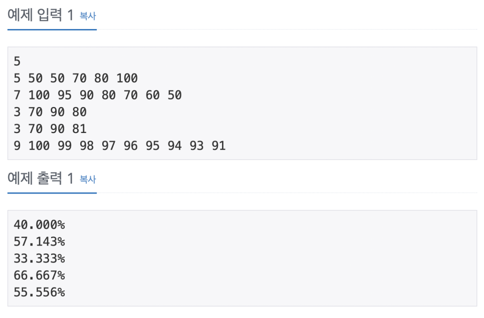printf("%.3lf%%\n",rate[i]);