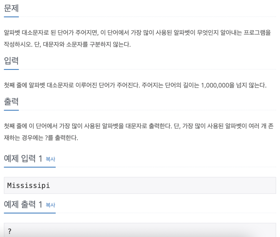 for(int i=max+1; i<26; ++i){ //개수가 같은 문자가 있는지 검열