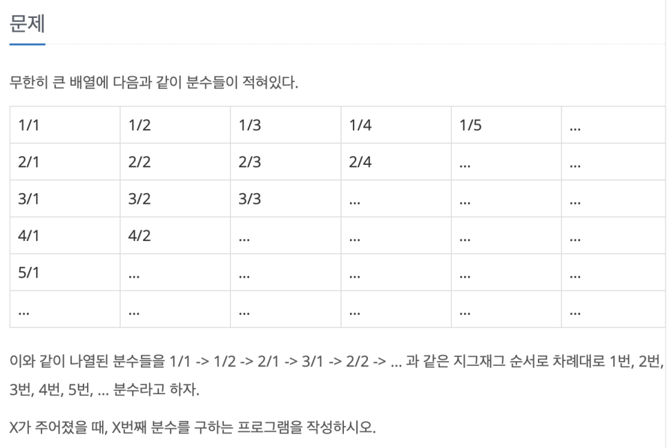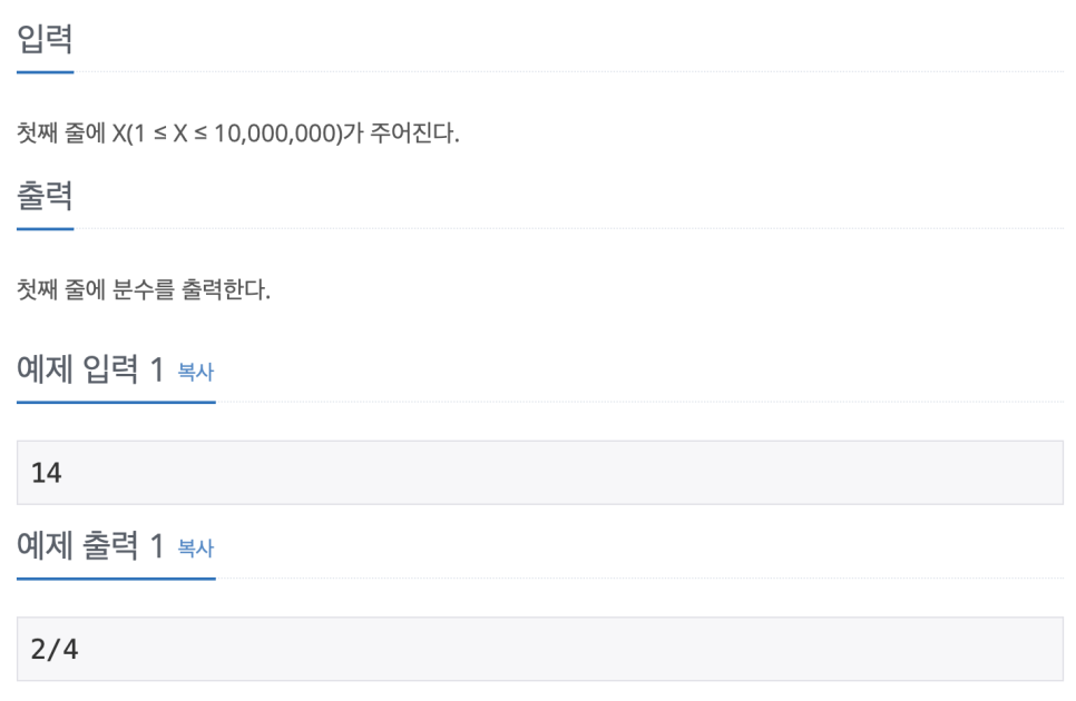 printf("%d/%d\n",num,maxNum+1-num); //maxNum+1해주는 이유는 해당 줄에서 분모,분자의 합이 최대값+1이기 때문